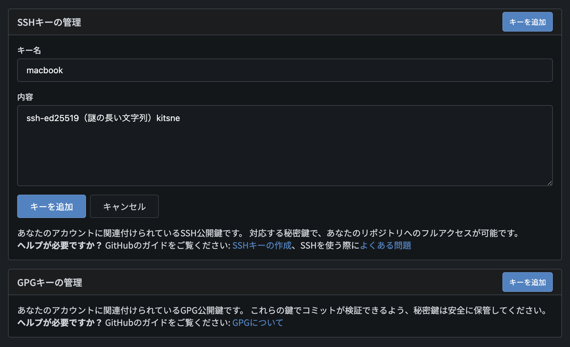 「内容」の欄に先ほどコピーした公開鍵(末尾のメールアドレスまで含む)をペーストしてください。SSH キーはデバイスに保存されるので、複数のデバイスをお使いの場合は今操作中のデバイスを特定できるような「キー名」を付けておくことをお勧めします。