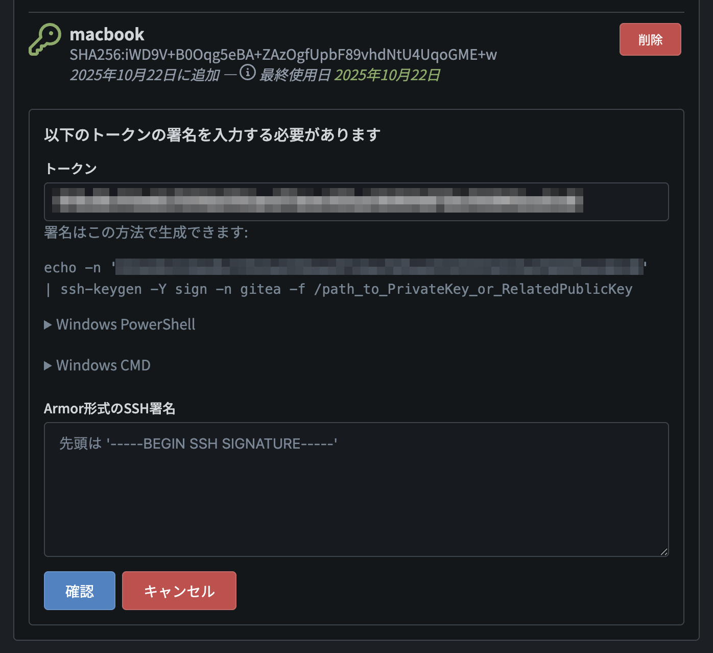 echo -n 'トークン' | ssh-keygen -Y sign -n gitea -f ~/.ssh/id_ed25519.pubすると、以下のような形式の SSH 署名が出力されるはずです。これを「Armor 形式の SSH 署名」欄に貼り付けて、その下の「確認」ボタンを押します。
